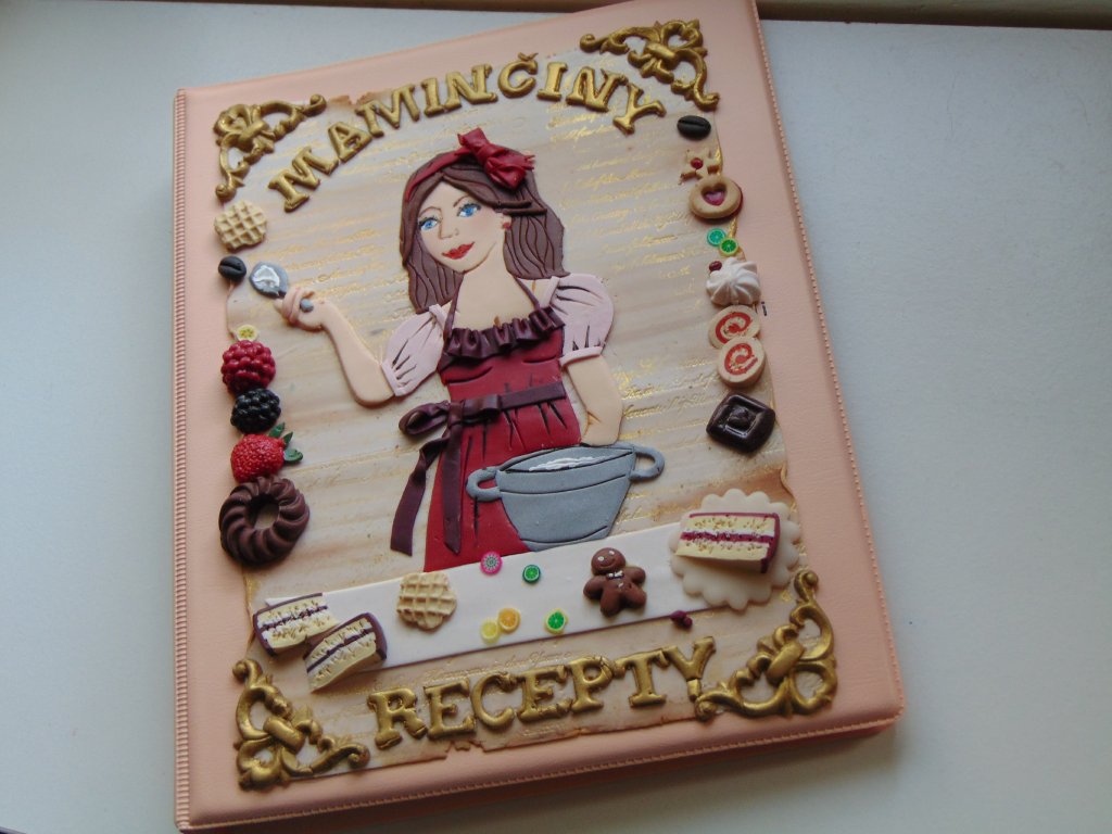 Kroužkový blok na zapisování a zakládání receptů ozdobený plastickým ručně modelovaným obrázkem z polymerové hmoty. Blok je velikosti A5 ,má 100 linkovaných stran a dá se doplňovat. Na zadní straně je menší obrázek .Blok je dodáván v soupravě s propiskou a záložkou se stejným motivem.