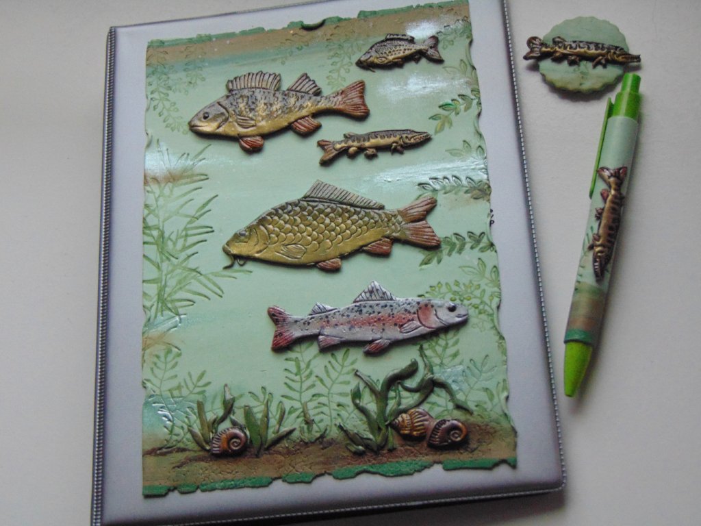 Kroužkový blok pro nadšené rybáře.Velikost bloku je A5.Má 100 linkovaných stran.V soupravě se stejně ozdobenou propiskou a záložkou.Obrázek je plastický,ručně vymodelovaný z Fimo hmoty.Je možné doplnit monogram .Nebo zvolit jinou barvu bloku.