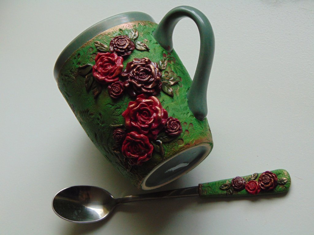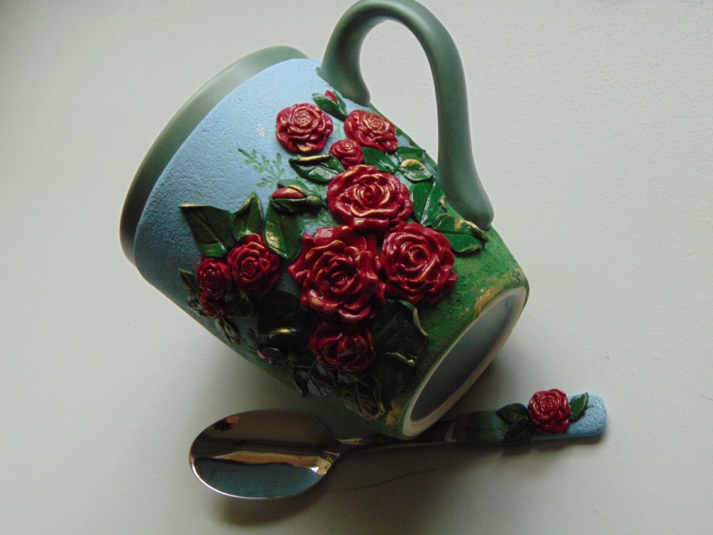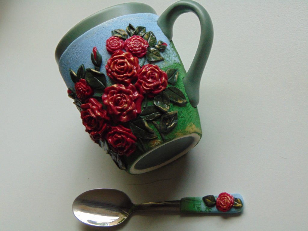 Hrníček s lžičkou ozdobený motivem slunečnic ,který je ručně vymodelovaný z polymerové hmoty. Velikost cca 350 ml. Není vhodné umývání hrníčku v myčce nádobí ale jen ruční mytí .