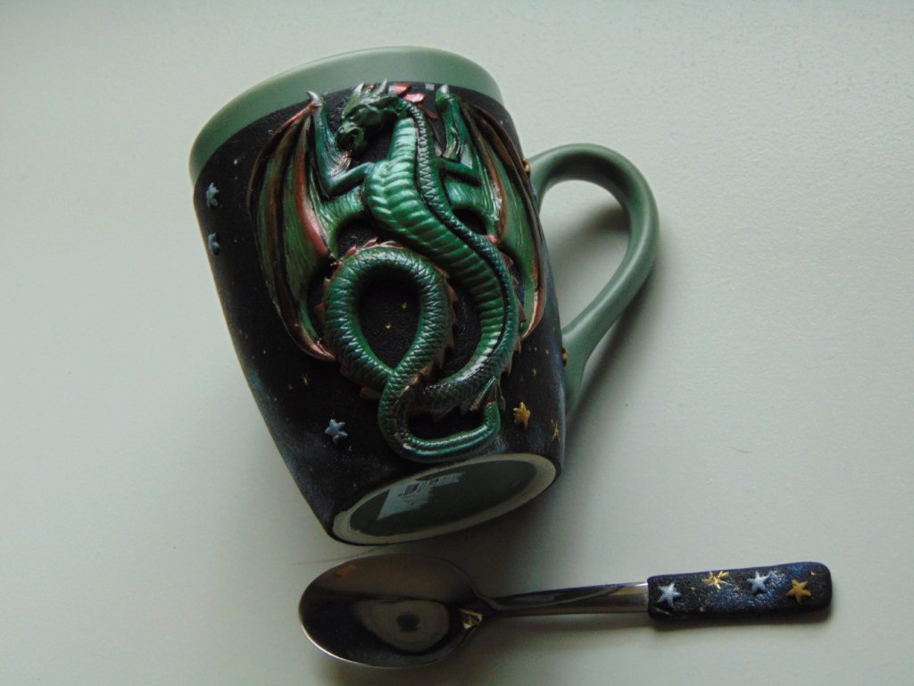 Hrníček ozdobený plastickým motivem vymodelovaným z polymerové hmoty. Není vhodné umývání hrníčku v myčce, aby nedošlo k poškození motivu. Ale jen ruční mytí. Velikost 400 ml.
