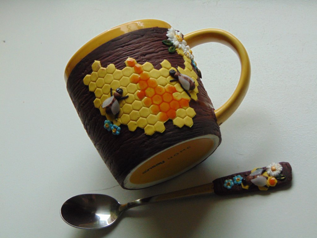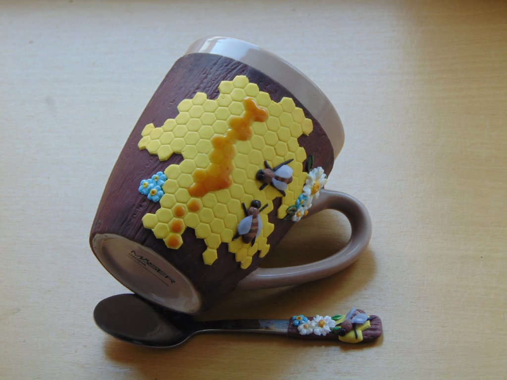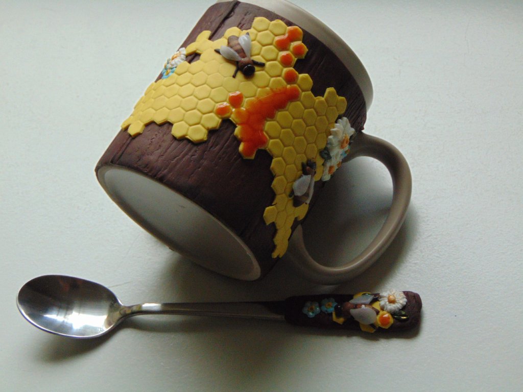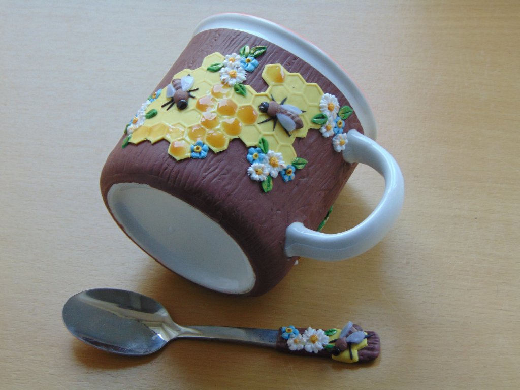 Hrníček s lžičkou ozdobený motivem který je plastický, ručně vymodelovaný z polymerové hmoty .Velikost hrníčku je 420 ml.Je v soupravě se stejně ozdobenou lžičkou .Není vhodné umývání v myčce, ale jen ruční mytí aby nedošlo k poškození motivu.