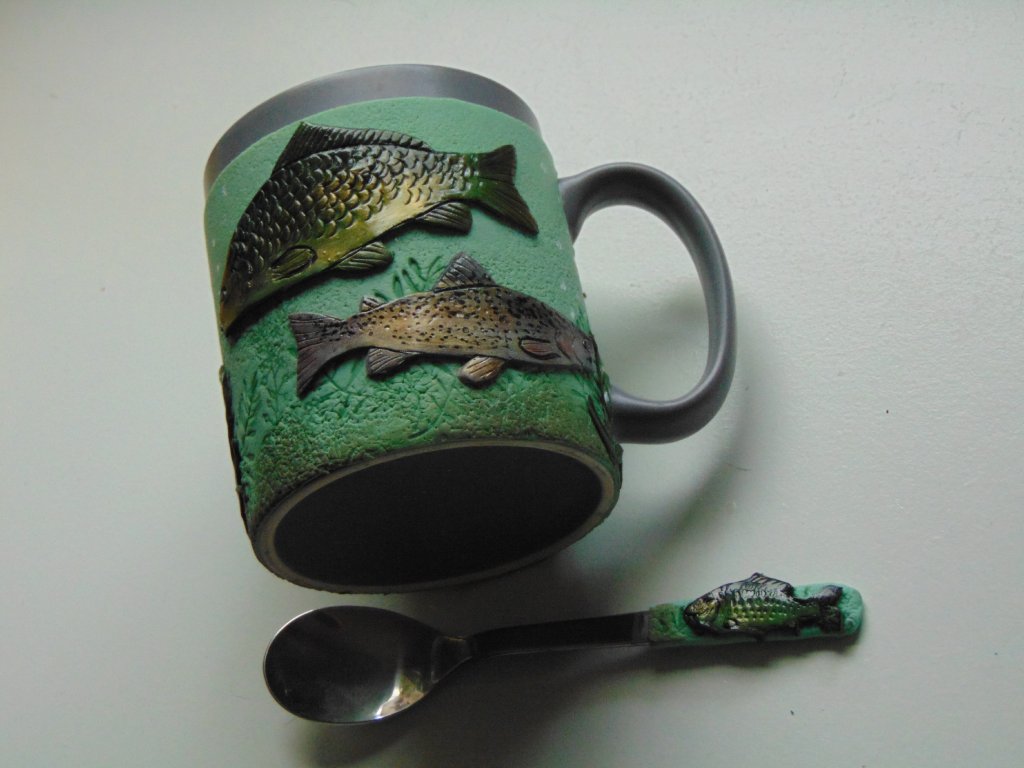 Hrníček s lžičkou ozdobený plastickým motivem vymodelovaným ručně z polymerové hmoty. Velikost hrníčku je cca 350 ml. Nedoporučuje se umývání v myčce nádobí, aby nedošlo k poškození motivu. Nejlépe je hrníček umývat ručně pod tekoucí vodou.