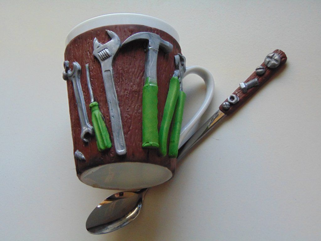 Hrníčky a lžičky ozdobený plastickým motivem nářadí pro kutila .Velikost je cca 400 ml . Není vhodný pro umývání v myčce nádobí .Nejlépe je umývat hrníček a lžičku jen ručně ,aby nedošlo k poškození .