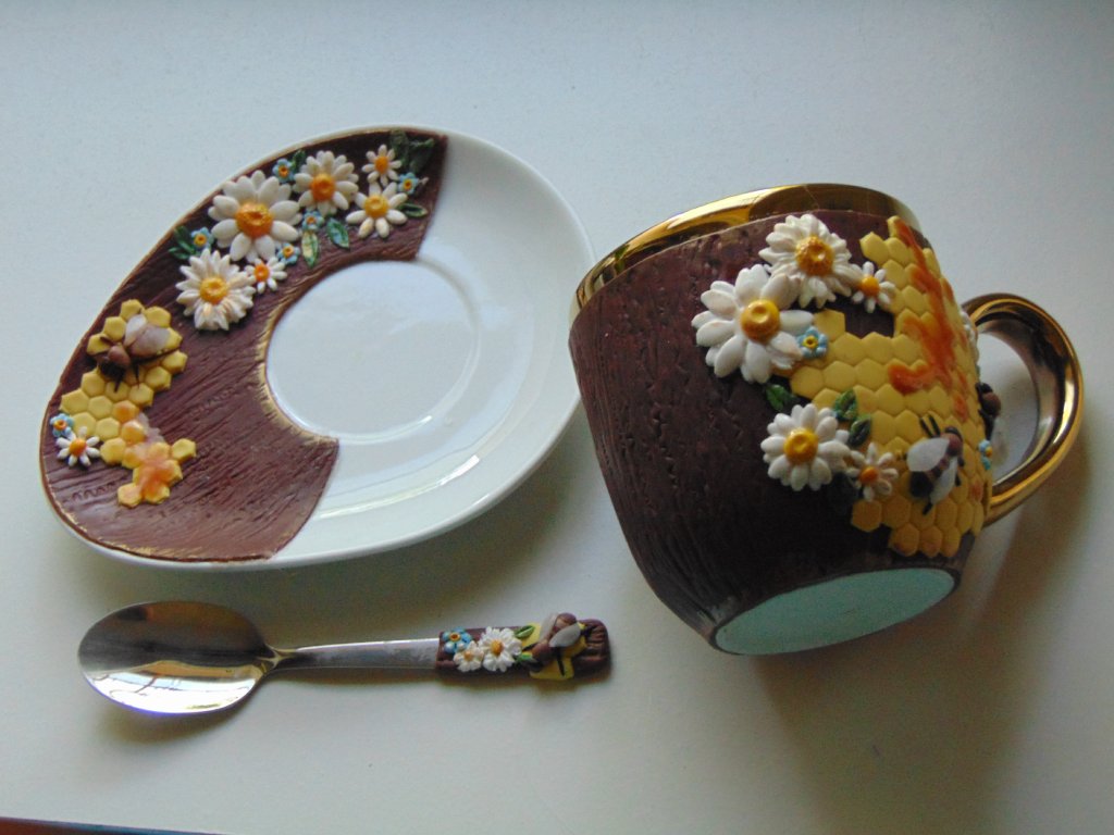 Plastickým motivem medové plástve a včeliček ozdobený šálek ve velikosti 300 ml+ podšálek+ lžička. Motiv je vymodelovaný z polymerové hmoty. Není vhodné umývání v myčce ,aby nedošlo k poškození .Nejlépe je vše umývat jen ručně.