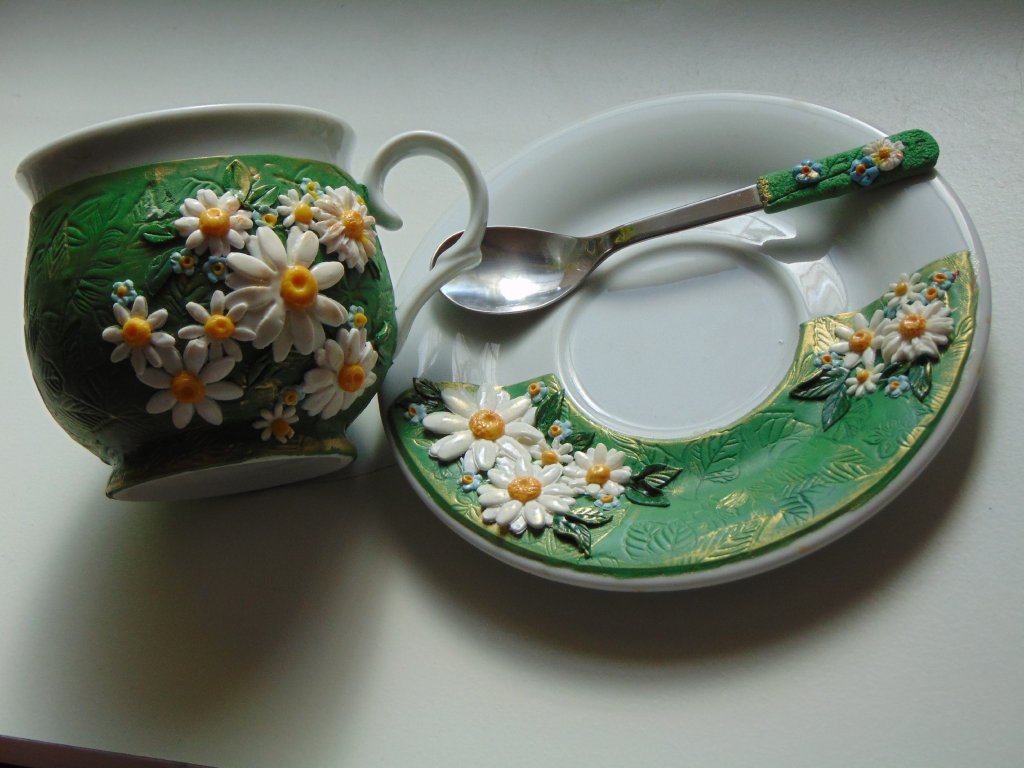 3álek ve velikosti 400 ml v soupravě s podšálkem a stejně ozdobenou lžičkou.Vše je ozdobené plastickým motivem,který je ručně vymodelovaný z polymerové hmoty.Není vhodný pro umývání v myčce,ale jen ruční mytí aby nedošlo k poškození.